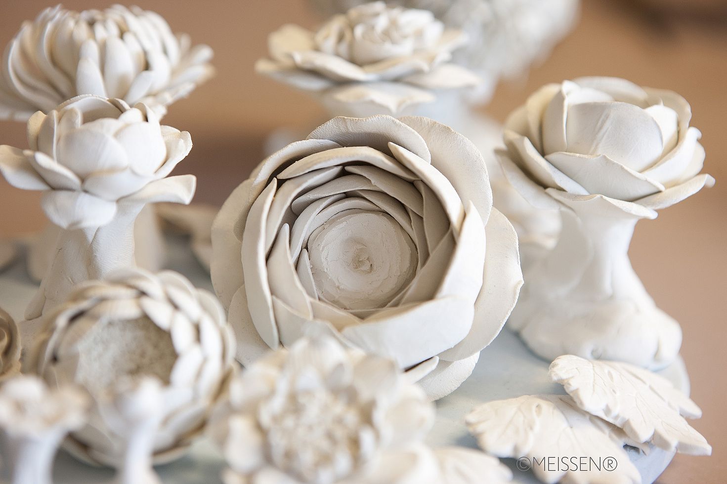 Kleine Dekorelemente, wie etwa Blätter und Blüten, werden komplett von Hand geformt. Die zarten Blütenblätter werden quasi durch den "Fingerabdruck" des Bossierers modelliert, indem die Fingerlinien die Blattadern bilden. So entstehen Belege wie Ranken oder ganze vollplastische Blüten. Jedes Stück ein Unikat.